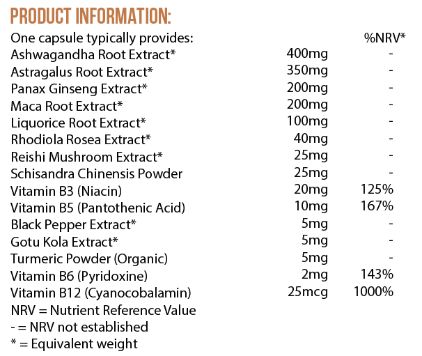 Stoneground Brown Rice Flour (Oryza Sativa), Capsule Shell: Hydroxypropyl Methylcellulose (HPMC), Cordyceps Mushroom Fruiting Body Extract (Cordyceps Militaris), Ashwagandha Extract (Withania somnifera) KSM66, Deglycyrhized Liquorice Extract (Glycyrrhiza Glabra), Schisandra Chinensis Berries Powder, Vitamin B3 (Nicotinamide), Peruvian Maca Root Extract (Lepidium Meyenii), Pantothenic Acid (D-Calcium Panthonate), Rice Extract (Oryza Sativa), Black Pepper Extract (Piper nigrum), Panax Ginseng Extract (Panax Ginseng), Turmeric Root powder (Curcuma Longa), Vitamin B6 (Pyridoxal 5 Phosphate), Reishi Mushroom Extract (Ganoderma Lucidum), Gotu Kola Extract, Vitamin B12 (Cyanocobalamin).