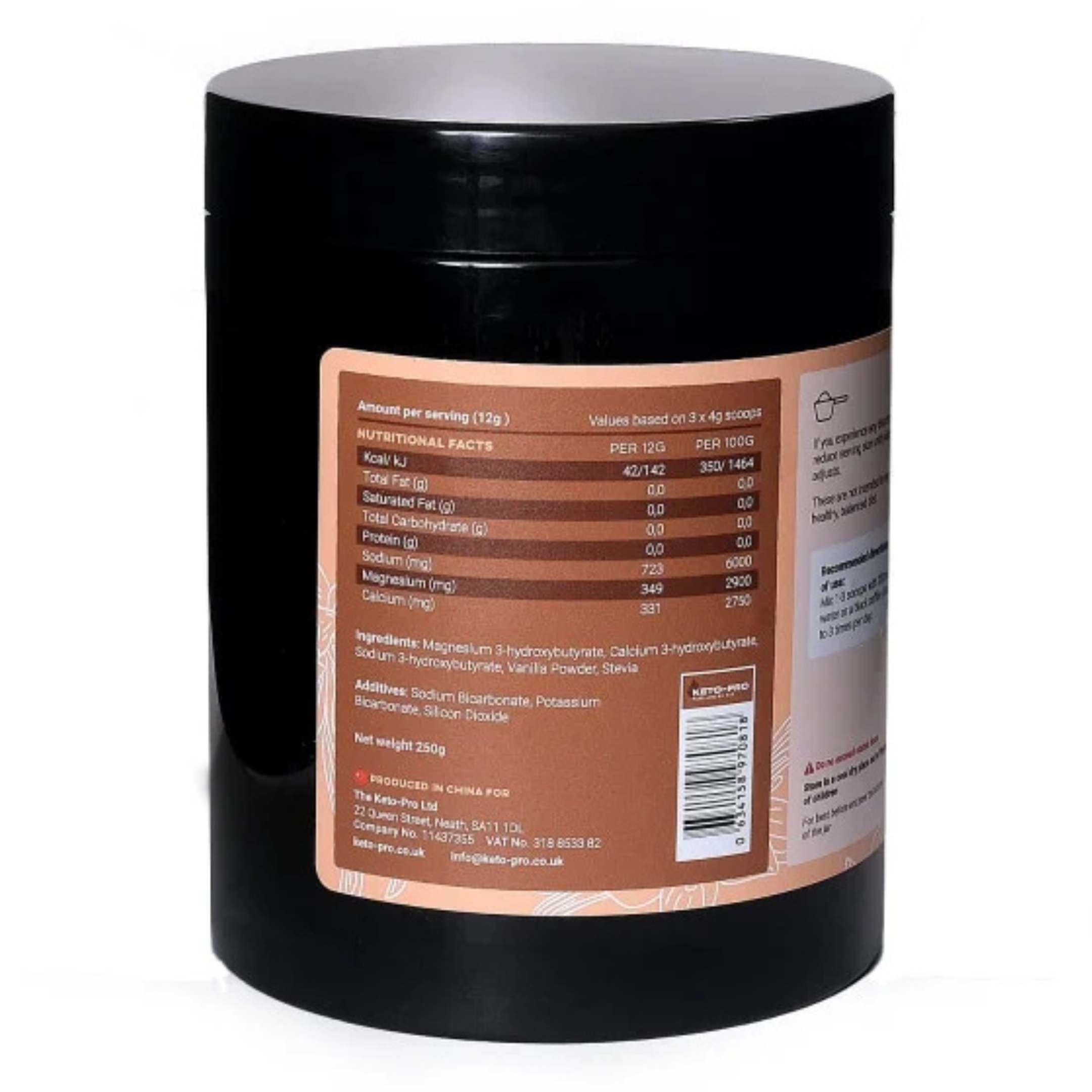 Chocolate flavour: Magnesium 3 hydroxybutyrate, Calcium 3 hydroxybutyrate, Sodium 3 hydroxybutyrate, cocoa powder, stevia, sodium bicarbonate, potassium bicarbonate, silicon dioxide.